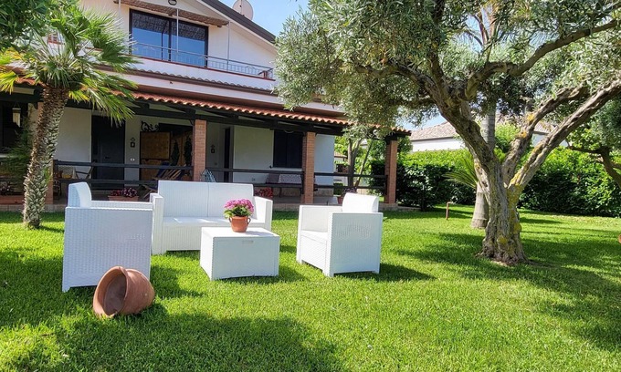 Villa surrounded by greenery, with large garden with trees and lawn, quiet, very airy position, equipped with private barbecue, satellite TV, deck chairs, hot shower also in the garden, private parking in the garage. The villa is central to all the services needed to spend your holidays in absolute relaxation. Hospitality and hospitality reign.