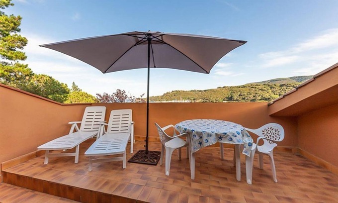 The apartment is located on the first floor of a building, surrounded by nature and overlooking the Bay of Mola. Just 100 meters away is the Dog Beach, a beach with mixed sand and gravel dedicated to our four-legged friends. The renowned beaches of Lido di Capoliveri, Zuccale, and Barabarca are just a few minutes\' drive away, as are the lively centers of Porto Azzurro and Capoliveri.
