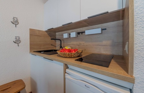 On the raised ground floor of an attractive, small residence, the apartment has been thoughtfully decorated throughout. The living room has glass doors which lead out onto a private balcony, offering magnificent mountain views. The balcony has two comfortable chairs where guests can relax in the sun. Indoors, there is a sofa and a flat-screen TV. The wooden dining table, which seats 4, is between the living area and the open-plan kitchen. The kitchen is equipped with a cooker hob, oven, fridge and kettle.