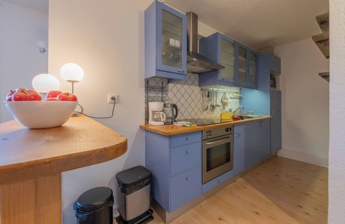Back indoors, the open-plan living space is furnished with two comfortable sofas, a flat-screen TV and a dining table with chairs which is next to the newly fitted kitchen. The kitchen is separated by an unusual glass brick breakfast bar. It is well-equipped with a cooker hob, oven, microwave, dishwasher, fridge/freezer and coffee machine.