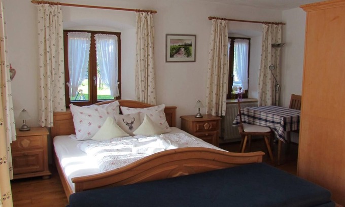 Fernab von Stress und Hektik sollen Sie ein paar schöne Urlaubstage verbringen.Unser Bauernhof liegt ruhig aber trotzdem zentral. Man hat einen wunderschönen Blick auf die Berge.Kinder sind bei uns gern gesehene Gäste. Unsere Kälber freuen sich über einen Besuch der kleinen.Unsere Ferienwohnungen und Apartments verfügen alle über eine voll ausgestattete Kochnische, Flachbild TV und freiem WLAN.Ein Grillplatz, Spielgeräte für die Kinder und Tischtennis sind vorhanden. Sehenswürdigkeiten wie das Schloss Herrenchiemsee, das Museum Salz & Moor sowie verschiedene Bergbahnen sind mit öffentlichen Verkehrsmitteln sowie mit dem Auto gut zu erreichen.Keine Haustiere erlaubt. Bettwäsche und Handtücher sind vorhanden. Wir freuen uns auf Ihren Besuch.