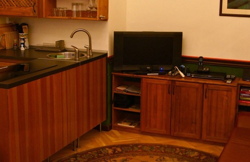 Apartment Olive is a small, cozy garden apartment, opening into the courtyard of a landmark building in the very heart of Budapest: the geographic fulcrum of the Belvaros (the historic inner semi circle around the Danube) is Ferenciek Square, and Apartment Olive’s building fronts directly onto that square. It’s one of the city’s oldest residential buildings (the building is a bit tattered), sitting directly across from Budapest City Hall.