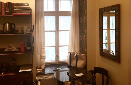 If you know Budapest perhaps you have a sense of the ways in which the neighborhood is difficult to describe...while the building that houses Olive is a landmark in the midst of the bustling center city, the apartment is quiet, and one has the feeling of getting away from it all when one is inside (the doors to the courtyard from the street are locked to outsiders after dark).