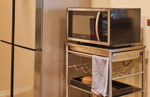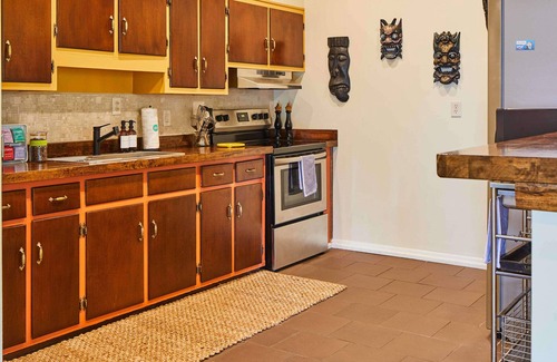 This unforgettable apartment promises a wonderful stay. Enter the door to the bright, open, and colorful living area. Featuring three distinct areas -- a den, kitchen, and dining area -- this open-concept living area is a wonderful place to relax and step back in time, with modern comforts, of course. The sun-filled den invites you to lounge while you listen to a record from our fireplace collection, read a book, or watch your favorite shows on Netflix, Disney +, or Hulu (all included). Hungry? Step over into the fully-stocked kitchen and dining area. The kitchen is playful and cheery, delightfully 70s with decor, but decidedly modern with its new, stainless steel appliances. It boasts everything you would need to cook a formal meal or a quick snack. Enjoy your creation at the vintage dining room table, specially sourced for the space, complete with fun swivel chairs, which will take you back to your childhood in an instant. Want a drink? Pull up to the custom bar, perfectly situated between the kitchen and living room.
