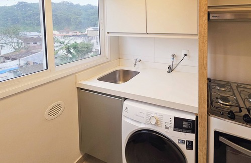 - Área de serviço: situada junto a cozinha, com máquina de lavar roupas.