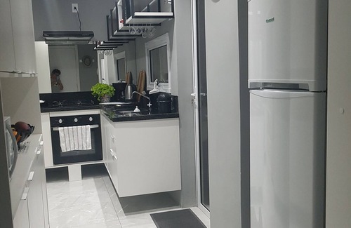 TV 43" smart na sala e no quarto, gelatedira duplex , microndas, fogao e forno .