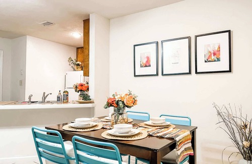 Enjoy coming home to this cozy, comfortable and well appointed townhome. Feel uplifted thanks to modern updates, bright designer colors, and fun features throughout. This end unit is more private with a lush backyard & patio. Large smart TV, equipped with free Netflix and Hulu accounts, an open kitchen, living, & dining layout with soft luxe upholsters lend a welcoming feel to shared living spaces. Enjoy an abundant amount of shopping and downtown are just a short drive away.