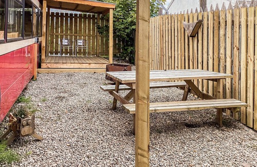 Bedroom 3: 6 x Single (3ft) Beds. Electric central heating, electricity, bed linen, towels and Wi-Fi included. Grounds with sitting-out area and garden furniture. Private parking for 2 cars. No smoking.. Step aboard this beautifully converted double-decker bus for a unique and charming holiday experience, offering comfortable accommodation for up to 8 guests—the perfect setting for an unforgettable staycation. As you step onto the lower deck, you’ll find an inviting open-plan living area with cosy seating and a spacious dining space for shared meals.