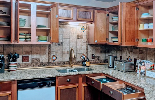 The kitchen is fully stocked and includes a coffee/tea bar and snacks in the pantry, making it easy to prepare meals and snacks for your stay. The bathrooms are also well-stocked with plenty of towels, and there are even hair dryers available in both.