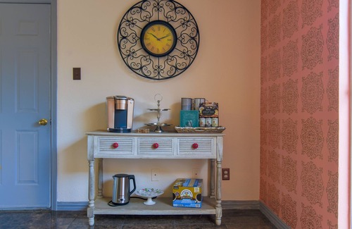 The coffee bar has a Keurig K-Elite coffee maker and K-pods are provided along with a variety of tea for your enjoyment.