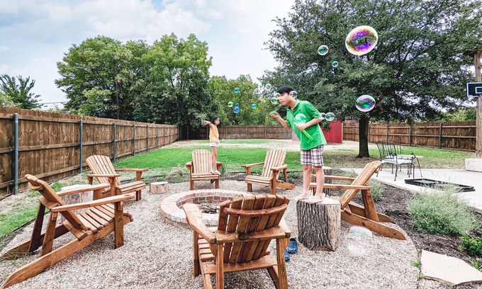 Step outside and enjoy the spacious backyard of this rental property, perfect for relaxing and entertaining during those hot summer days. With a cooling mist system in place, you can beat the heat while lounging in one of six Adirondack chairs or roasting marshmallows around the oversized fire pit. It's a favorite spot for people of all ages, including children and pets. Plus, you'll be just a short distance away from other popular attractions in the area, such as Globe Life Field, Choctaw Stadium, and Six Flags Over Texas.
