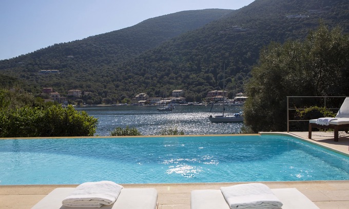 The villa has a large garden on various terraced levels with stone walls and stone steps. The swimming pool is large (40sqm) and is beautifully designed with teak loungers and umbrellas set out on its terrace. From the pool and large outdoor dining area, you can spend hours gazing the green hillsides of the bay of Sivota and the yachts as they glide past.