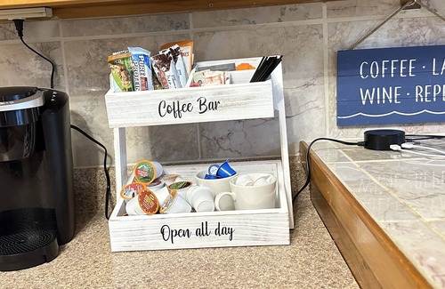 Newly renovated living room with brand new furniture and 65" smart TV. We have provided plenty of seating inside and out for all guests. Kitchen is stocked with everything needed for cooking and baking.