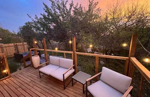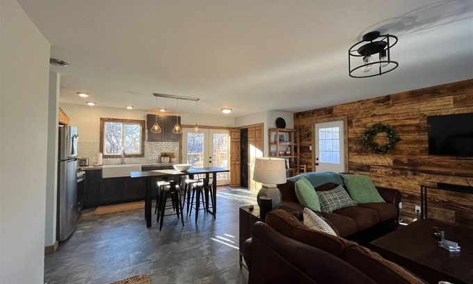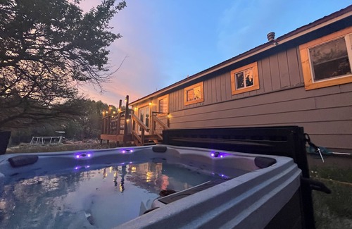 A sweet spot in the heart of the historic Village of Arroyo Seco sleeps 4 in two bedrooms with two full baths, and open concept living, dining and entertainment space on the other end of the home. French Doors in the kitchen open onto the deck which leads to the Hot Tub. Propane Gas Grill and outdoor seating and cafe table extend the living area outdoors. Front porch and concrete parking pad, private yard and gardens in a pastoral setting close to restaurants, shops and galleries, 20 minutes to Taos Ski Valley.