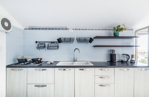 DESCRIPTION: “Holiday Apartment Artemide” is a small holiday house renovated recently in a modern style. It is located on the second floor and top floor of a small single building, it has an inner space of about 40 square meters and is divided into three areas: "living room - dining room - kitchen" in one room, double bedroom and bathroom with a shower. Outside the holiday house, you can enjoy a wonderful terrace of around 50 m2 with a sea view, it is partly covered by a large wooden roof for relaxation during the hot summer days. The terrace is equipped with comfortable deck chairs, a sofa, and a table with chairs for open-air lunch and/or dinner. There is also a barbecue available, and in a corner of the terrace, there are a washing machine and a sink. The house is perfect for hosting two or three people because it has a single sofa bed in the living room.