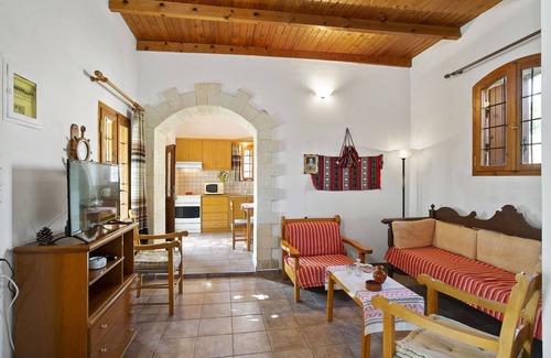 Kitchen with original features including bread oven, living room with Cretan archway, bathroom with shower & a double bedroom with air-conditioning.