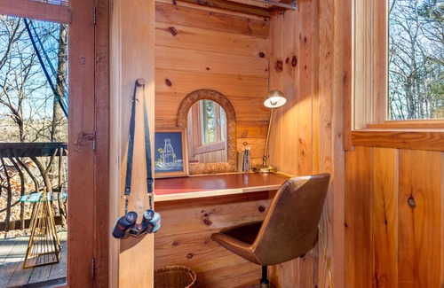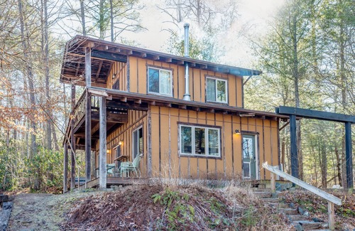 Immerse yourself in the enchanting treetop charm of our stylish cabin, nestled high above the Ivy River. Unwind in this lovingly crafted retreat, adorned with wood milled on-site. Relax on two private decks with winter vista views and summer Appalachian flora and fauna. Cozy up by the working wood stove or indulge in a soothing jetted bath. Only 5 minutes from downtown Marshall, 20 minutes to Asheville, our cabin is the ideal respite for those seeking an escape from busy city lives!