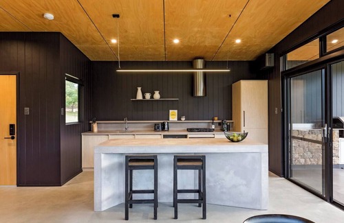 The open-plan living area offers a plush lounge set and TV by a stone fireplace—perfect for chilly evenings. Play chef in the sleek, fully-equipped kitchen with a concrete island and hidden appliances and host an intimate meal in the stylish indoor dining space. Outside, opt for alfresco dining or drinks on the stone patio, complete with a BBQ and panoramic lake views.