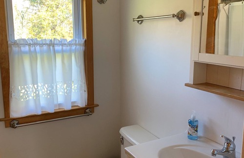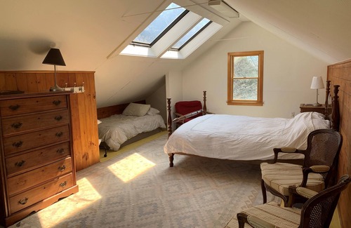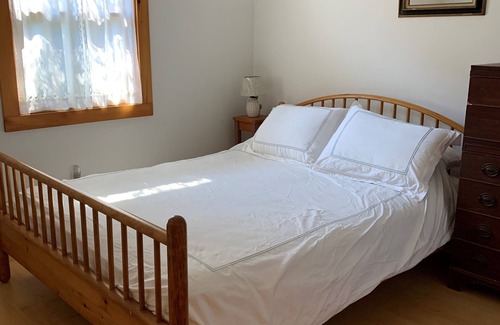 Sun filled traditional two story barn with all the comforts of home. One large bedroom upstairs and one bedroom downstairs both with queen beds. Living/dining/ kitchenette and laundry room and one bathroom. 2 minute walk to the village, movie theater, restaurants, coffee and all the stores and an easy bike ride to the ocean beach. Perfect summer retreat. Nice yard to BBQ and play. Private parking.