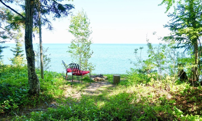 Wrapped around an original fieldstone fireplace, this 2-bedroom cabin with 1.5 baths will thrill you with its cliffside views of Lake Superior and the Porcupine Mountains. Rustic and modern, the cottage was designed by two Chicago artists who also designed the Eleanor and Sam Himmelfarb House, now on historic registries. With Frank Lloyd Wright touches, the cabin features floor-to-ceiling windows and walk-out decks from each room where birds are ever-present and sunrise and moonrise provide spectacular entertainment. The naturally wooded perch includes birch, maple, spruce, and pine along with a variety of native flowers and lupine. A stone's throw from sugary Big Bay Beach, the cabin uniquely mixes antique barn wood boards and white-washed walls to create a dreamy aesthetic where time stops, waves lap, and sun stirs the soul. Evenings spent around the campfire with light breezes off the lake are perfect for stargazing and reflecting on the cosmos. The elegant master bedroom features a queen bed and its own half bath. The second bedroom is a converted artist studio with vaulted ceilings and wraparound windows with wooded and lakeside views along with 1 queen and 1 double futon bed (extra day bed available in the main room). A light-filled galley kitchen and cozy bath retain 1950's touches. Enjoy an easy walk or use of our free bikes to the Riviera of the North (Big Bay Beach) or head to the tiny town of LaPointe for open-air bars and farm-to-table cafes.