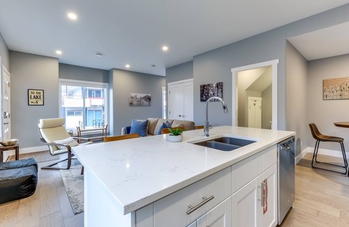 Two bright and warm bedrooms with mountain views, each with their own ensuite washroom and TV's with cable. There's also another half bathroom on the main floor. Great for couples, families, or a few friends, with the option to add more space for children or 1 adult on the pull-out couch in the living room. The open concept main floor kitchen is perfect for mingling. Enjoy hotel-like comfort and all new furnishings with an Okanagan-inspired decor that will make you feel right at home. There's also small private backyard space with BBQ and patio furniture. There is 1 included and dedicated parking space, other parking is on the street but subject to availability. Enjoy the comforts of home with cozy beds, high speed wifi, board games, Apple TV (you can use your own Netflix account), half up half down blackout blinds in the bedrooms, and a very well equipped kitchen. You'll also have access to the laundry area (washer +dryer). There is a shed with lock in the backyard for guests to store bikes, hockey equipment, floaties, etc.