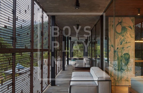 Rusty block slides to open for the outside world. Together with burned wood fasade this space brings into the wild greenery an element of fire.