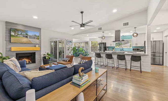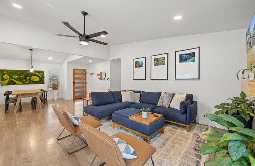 We've got it all - comfy beds, a beautiful 10 ft cowboy pool with 55" outdoor TV, and an amazing backyard with BBQ grill, an outdoor dining table & couch, & lawn games all surrounded by string lights. Minutes from Austin Breweries, Zilker Park, downtown, East Austin, & lots of unique eateries, and picturesque cafes!