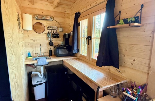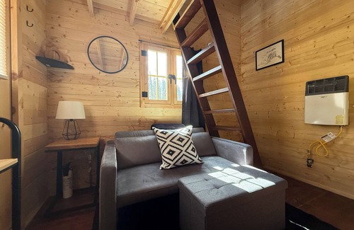 These lakefront cabins features breathtaking views of the Alaska Range and our private lake. The open-plan living area downstairs includes a well-equipped kitchenette and a full bathroom with shower. The upstairs loft, with its 7-foot ceiling, boasts a queen bed and epic views. Each cabin can accommodate two adults comfortably. The cabin is designed for relaxation and connection with nature. These cabins are rented together as a pair.
