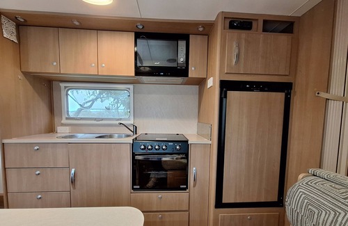Though cozy, the caravan is fully equipped with all the essentials, including air conditioning, a kitchen, fridge, microwave, shower, toilet, and even a washing machine. It’s perfect for couples looking for a private, intimate stay.