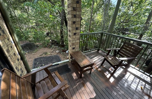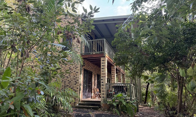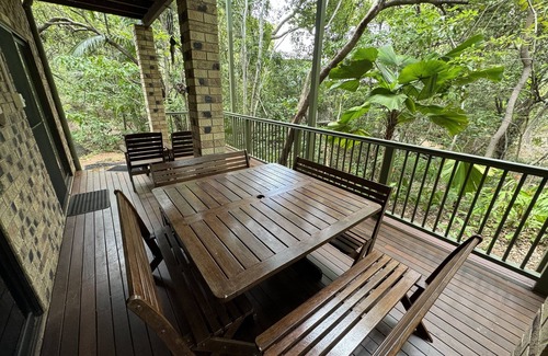 Avalon is ideally suited to a family or couples. Split levels means there are multiple retreats that suit all. On the lower floor is the main air-conditioned bedroom with en-suite and flat screen TV/DVD. Just step off the deck to enjoy watching the birdlife whilst relaxing on the chaise lounges. The Asian inspired main lounge opens to a wide deck with outdoors settings and Weber barbecue. On the next level is a kitchen, which is built for entertaining. Masses of bench space and fully equipped kitchen make self-catering easy. Another more formal dining area completes this level. You can also escape to the back yard and national park for some quiet time bird watching and enjoy a refreshing outdoor shower. The top floor has two bedrooms, a separate bathroom with tub and shower and separate toilet as well as a sitting/reading room with flat screen TV. The top deck additionally has a verandah that puts you up amongst the treetops. The house is fully airconditioned with fans in all rooms. Large screened doors and windows open all areas up to natural breezes.