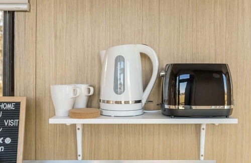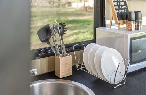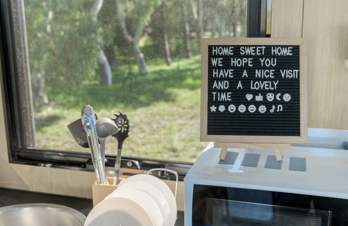 A cozy 139-square-foot tiny home and one of Beverley's peaceful holiday homes with easy access to water, split air conditioning, a kitchenette, cooking equipment, and excellent bathroom facilities. These amenities include an eco-friendly cassette toilet with a removable waste-holding tank, hand basin, and shower (gas heated for hot showers).