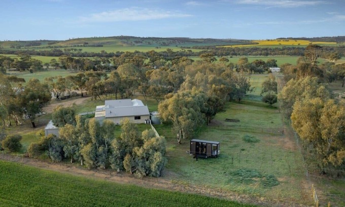 The perfect tiny home set among the gums, a great sunny spot with stunning hill views and flowering wheat or canola fields in the winter, and blossoming yellow sorrel and daisies in the summer—best visited between April and November. It is located amidst citrus fruit trees that flourish in the fields and magnificent wildflowers that bloom between August and October.