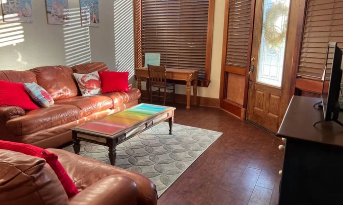 You won’t want to leave this charming, one-of-a-kind place. Enjoy of a cozy and classic style while you rest in the soft king room we have to offer and share your experience with the love ones in the two twins bed. Precious living area with leather sofas