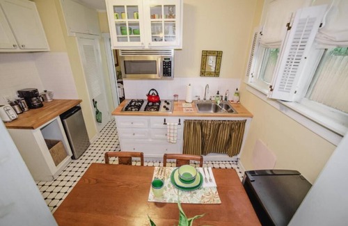 The fully-stocked kitchenette has everything you need. There is a four-burner gas stove, microwave, mini fridge, sink, coffee maker, and basic pots and pans, dishes and silverware. You can sit at the breakfast table with your morning coffee and plan your day. We stock breakfast foods in the fridge and pantry, including cereal, pancake mix, real maple syrup, spices, butter, milk, fresh Florida orange juice, tea, coffee and more.