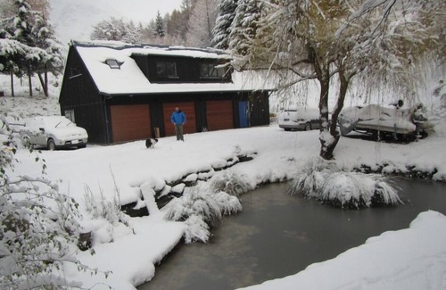 Living space is located upstairs and is fully furnished with 2 bedrooms (1 King, 1 Queen bed), 1 bathroom, open plan kitchen/living with dishwasher, fire (wood provided), heat transfer system and heat pump for heating. Downstairs is the main entrance and our garage/storage/workshop but one garage and washing machine is available along with plenty of space for storing bikes/skis/luggage etc if needed. Wifi is available