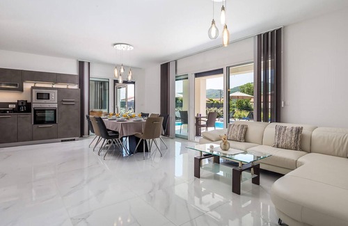 Are you planning a vacation with your big family or do you want to spend a vacation together with two families? Here you will find your personal vacation oasis. You have a large amount of space here without having to miss your privacy. The number of bedrooms and bathrooms promise you that you will not get in each other's way and everyone will have their retreat. You'll come back together in the beautiful, large living room, where you can step right out onto the covered patio and have your morning coffee. The kids will probably jump right into the heated swimming pool in the morning and play in the water. Besides the sun loungers, around the pool, there are also private balconies where you can retreat and read an exciting book while continuing to keep an eye on the children playing in the garden.