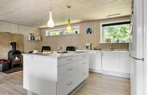 Your holiday home welcomes you with a cosy atmosphere and well thought-out furnishings. The interior impresses with its cosy wood panelling. Relax on the sofa, read a book or get together for a games evening by the crackling wood-burning stove. Cook together in the open-plan kitchen and enjoy your meals at the inviting, long dining table with room for the whole family.