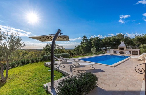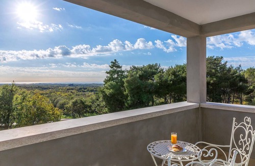 Take a break from your stressful everyday life in this charming, rustic villa for 8 people with a view of the hills and the sea. Start your well-deserved holiday with a dip in the private pool or read a book on the sun loungers under the parasol. The spacious covered terrace is the perfect place to enjoy meals prepared on the outdoor barbecue or in the fully equipped kitchen. On the ground floor, the kitchen, dining room and living room form a spacious open-plan area that is directly connected to the terrace by glass doors. A special addition to the living room is the fireplace, which creates a special atmosphere in the winter or summer months. Despite its rustic exterior, this special villa is equipped with all the amenities necessary for modern living - it is fully air-conditioned and has underfloor heating throughout the house. For added comfort, especially for families with children, there is also a spacious bedroom with en-suite bathroom and an additional separate WC on the ground floor.