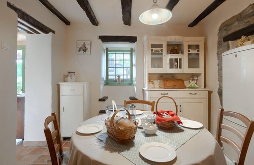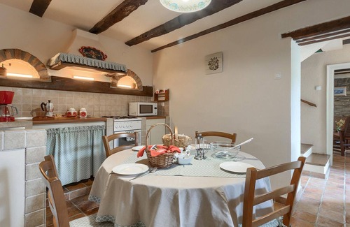 Experience a pleasant stay in this traditional and rural vacation home with swimming pool. Enjoy the beautiful flair of the village environment. You have a living area on the first floor and bedrooms on the second floor. Next to the pool there is an annex with bathroom, kitchen and a nicely furnished barbecue area. The house has an Eco Domus certificate and is ideal for outdoor living and its surroundings for an active vacation in nature.The large covered terrace offers you a magnificent view of the Ucka mountains, fields and hills, as well as the garden with pool. Enjoy delicious grilled specialties in the shade with a fine drop of wine from local wine growers. Active vacationers can go hiking and biking as well as paragliding. Next to the pool is an additional bathroom.