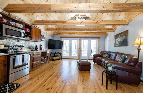 The main room features a vaulted ceiling with wood beams spanning from side to side and a hardwood floor to pull it all together. The downstairs has two bedrooms, one with a king bed and the other with a full over full bunk bed with a trundle pull out. We also have a loft that features a queen bed. The upstairs master suite has a king bed and a small kid bed. This home offers a perfect setting for a family retreat or lodging for a fishing tournament.
