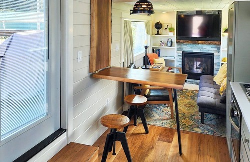 Our largest and most luxurious tiny home, Azalea was featured on season 3, episode 4 of Tiny Luxury and was designed to provide tiny home living in style. Featuring a custom built living edge table, hardwood floors, a custom kitchen with farmhouse sink, gas stovetop/oven and a full fridge, this tiny home has all the creature comforts - and then some. Sleep comfortably in the spacious loft with queen bed and bring the kiddos to chill out on the sleeper couch while enjoying the gas fireplace or outside on the large-plank cedar deck.