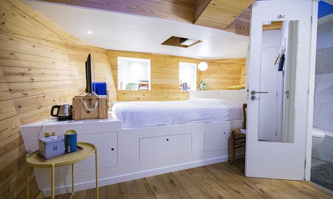 The B&B is a bedroom with a 200x160 queensize bed and a bathroom on an old ship. And there is a water cooker to make coffee or tea. It's very suitable for a couple.