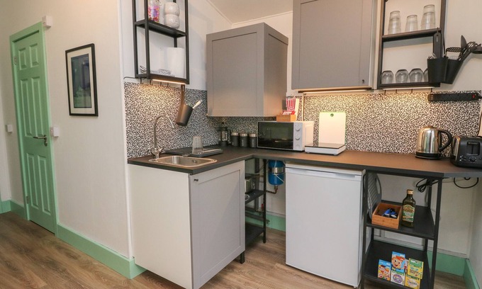 The kitchen is equipped with a refrigerator, as well as an electric kettle, cookware, and a toaster. Other amenities at this 1-bedroom, 1-bathroom rental include heating and wardrobe or closet.