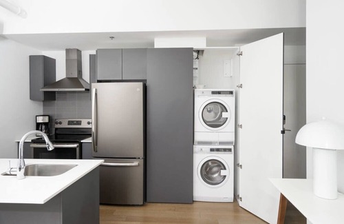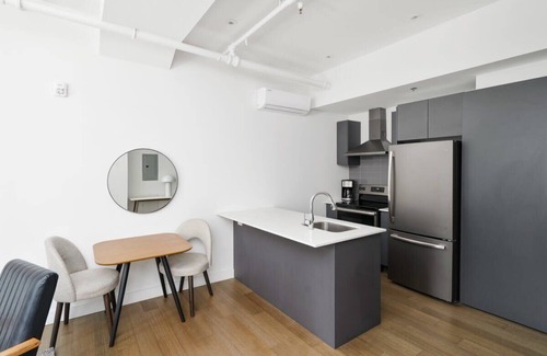 Modern apartment in historic Old Montreal with fully equipped kitchen, luxury bedding and decor.