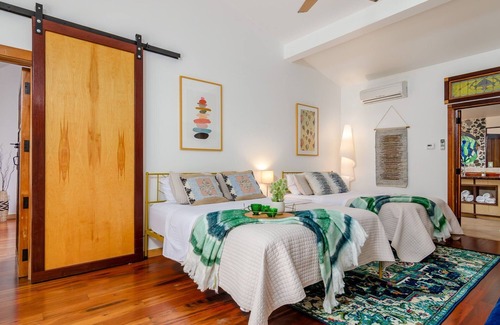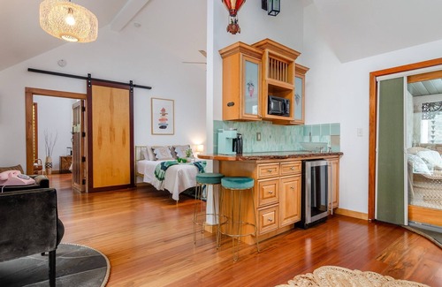 The Balloon Room is a colorful and unique suite on the property of New Park Event Venue & Suites. The Balloon Room has two queen beds, a sitting area, and a breakfast bar. It has two outside spaces - a sun deck and a covered patio. Balloon Room sleeps 4 people in beds, and then either one adult or two kids on the fold down couch.