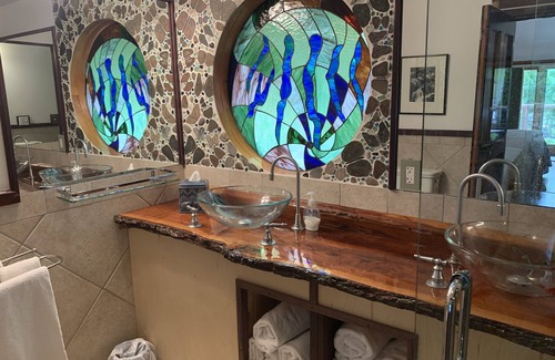The room includes a smart TV Netflix and Disney Plus. The luxury bathroom features a beautiful walk-in shower with see-through glass doors, a cobblestone wall with tile designs, uniquely styled tile floors, and a teak chair. The bathroom area has a remarkable mosaic window and dual glass vessel sinks, and a Toto Washlet Japanese bidet toilet.