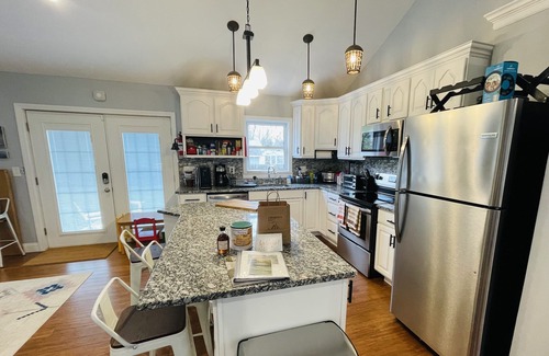 The open eat-in kitchen includes stainless steel appliances, pots and pans, chefs knives, and glasses for every libation you can think of. There are plates, bowls, silverware and kitchen and BBQ utensils. Appliances include a drip coffee maker, K-Cup/Nespresso espresso machine, Soda Stream soda maker, toaster oven, slow cooker, waffle Iron, Icemaker, rice cooker/steamer and a Ninja Professional Blender. New dishcloth and sponge along with dish soap, dishwasher pod, cleaning supplies and paper towels are provided along with aluminum foil, glad bags, and basics like salt, pepper, sugar, flour, oil and many other basics and essentials.