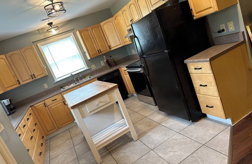 •A fully equipped kitchen with a butcher board center island and ample counter space for cooking and gathering.
