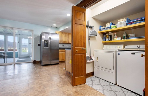 • Laundry Room with washer, dryer, detergent, full-size ironing board, and iron.