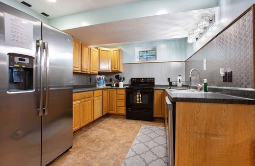 • Kitchen stocked with cookware, dishes, and extras like an Instant Pot, waffle maker, blender, and more.